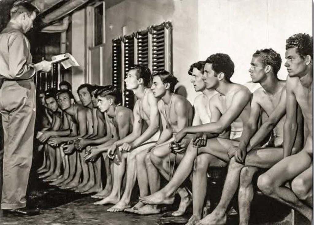 Venimmo messi in fila nudi come vermi (ebbi la conferma, ormai non del tutto inattesa, di essere fatto più o meno come gli altri), pesati, misurati, auscultati, poi costretti a sfilare davanti a militari in uniforme che, seduti dietro un tavolo, avevano, tra gli altri, il compito di accertare il nostro livello di alfabetizzazione. Ricordo che uno di loro mi porse un foglio e mi dettò la frase: «Italia, terra di santi, poeti e navigatori». Scrivere quelle parole in condizioni di completa nudità mi sembrò la più umiliante delle prove. Consegnato il foglio, ebbi la lancinante impressione di avere commesso a causa del turbamento un errore di ortografia. Eppure, secondo l’opinione unanime di quelli che mi conoscevano, l’ortografia era il mio forte!