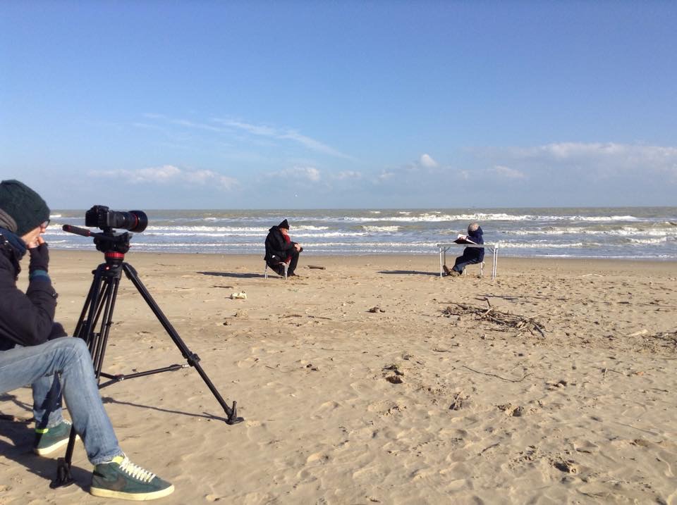 Passata la bufera dell’anno vecchio, il 2015 porta sole e lavoro (è un po’ altisonante ma anche beneaugurante per tutti). Il mare è sempre aggressivo ma senza l’alleanza con l’acqua che viene dal cielo diventa uno di quei giganti incatenati che ringhiano e si dimenano solo per dare spettacolo. Non so esattamente quanto abbiamo girato ma il minutaggio è decisamente buono; già al mattino abbiamo registrato svariate sequenze, e ne avremmo portate a casa ancora di più se i vagabondaggi di Robinson non fossero stati interrotti da passeggiatori con cane e senza cane, da salutisti che facevano jogging per smaltire la notte e da un signore di Silvi Marina che ha preteso di portare il nostro naufrago a visitare le carcasse di due tartarughe morte in un punto molto lontano della spiaggia, una grande e una piccola – madre e figlia, sosteneva lui, per caricare di pathos l’escursione. Naturalmente Robinson ha accettato, così per un po’ l’abbiamo perso. Recuperatolo, senza tartarughe, per fortuna, tutto è filato liscio.