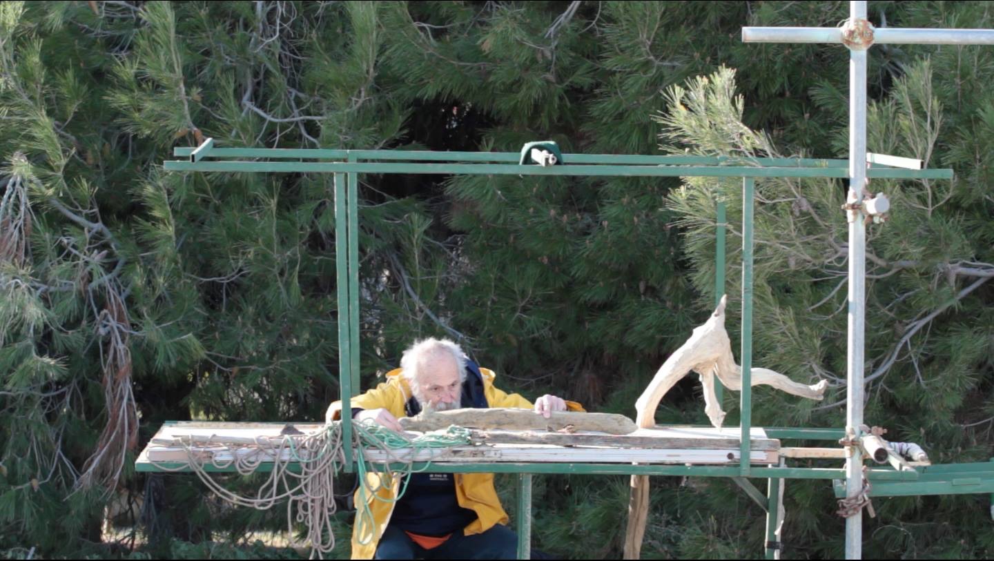 Fra le molteplici prospettiva che il romanzo di De Foe offre al lettore c’è anche il recupero, anzi l’invenzione, della manualità. Prima di essere rigettato esanime sull’isola, Robinson era soltanto un marinaio divorato da una febbrile smania di avventura (che sfocia in un desiderio di autodistruzione, considerando tutti i naufragi di cui è vittima in queste pagine). Nudo, sprovveduto e abbandonato da Dio, il marinaio Robinson deve inventarsi agricoltore, cacciatore, carpentiere. Questa foto di scena ci mostra Robinson in quello che si potrebbe definire il suo laboratorio. Paolo Brunati, scrittore e artista figurativo, una volta insediato in questa struttura che abbiamo trovato sulla spiaggia e che abbiamo arrangiato alla meglio, non voleva più uscirne. Se lo avessimo assecondato, ne sarebbe uscito materiale per alcune mostre.