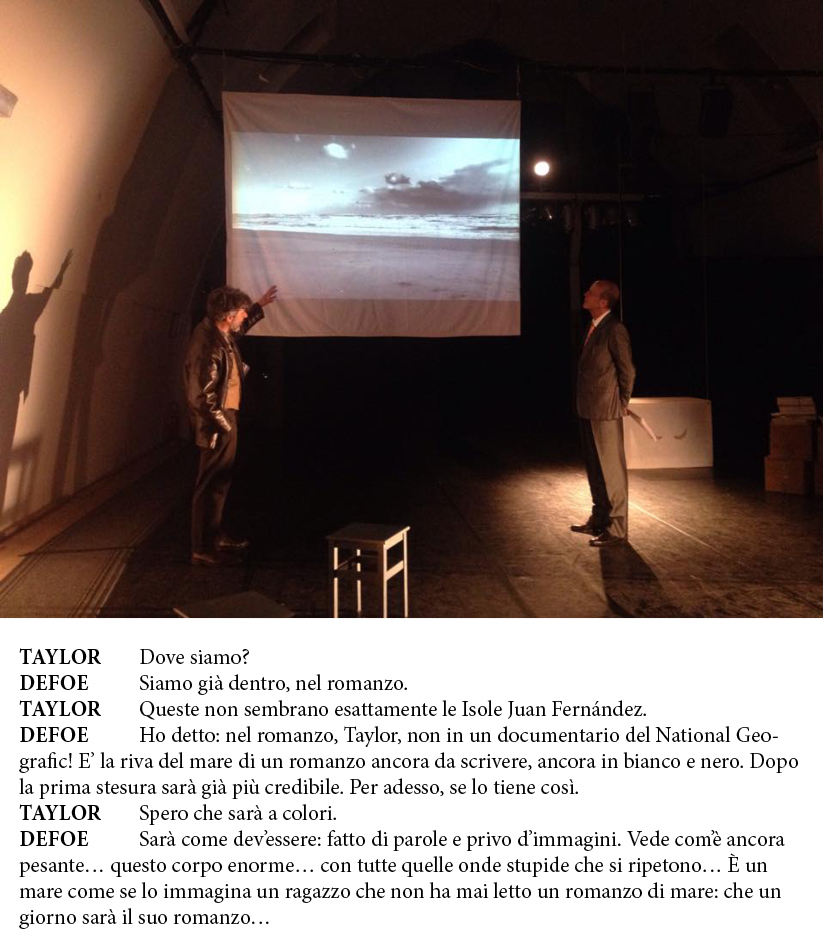 Daniel Defoe (a sinistra nella foto, impersonato da Massimo Giovara) ha spedito la sinossi del suo romanzo all’editore Taylor (Roberto Accornero). Nella nostra rappresentazione, la sinossi è un film molto basico che dovrebbe supportare il racconto (un po’ come le presentazioni in power point di un tempo, prima che mostrassero la loro intima mestizia). In realtà, non si sa bene chi sostenga chi, in questo impossibile tentativo di promuovere un romanzo non scritto con un racconto orale improvvisato. Ieri sera, mentre lo spettacolo scorreva, mi accorgevo di quanto fosse importante la presenza del mare sulla scena; può sembrare un pensiero tardivo, dopo tanti mesi di lavoro, ma è così: il mare cinematografico percorre tutta la pellicola; del mare raccontano i personaggi, ma tanta sovrabbondanza marina contrasta con la scenografia molto asciutta e sobria dell’ufficio di Taylor, nel quale si svolge l’azione. Per quella strana alchimia che si verifica sempre quando si assiste da spettatori a uno spettacolo che fino a qualche minuto prima era in costruzione, emergeva dalla messa in scena un imprevedibile contrasto fra serena (realistica?) certezza delle immagini cinematografiche e la natura aleatoria del dialogo; credo che nella percezione del pubblico i due linguaggi si siano integrati ma questo non lo sapremo mai (e non sarebbero servite le interviste all’uscita del teatro, tanto care a certe rubriche televisive).