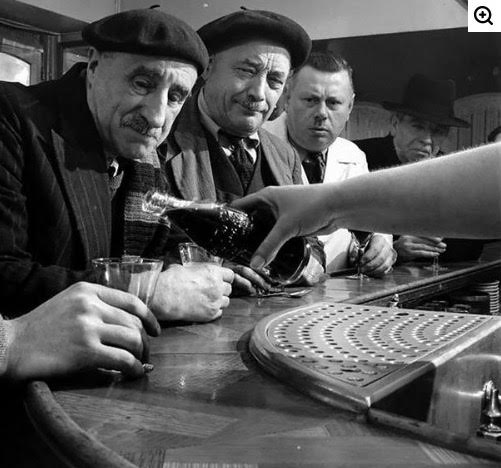 Non è un fotogramma di un film di Duvivier, come potrebbe sembrare: la foto ritrae quattro amici al bar, anzi nel bistrot di una cittadina della provincia francese, nel 1950. Stamattina, Bertrand se n’è uscito con un’altra delle sue trovate – è un tipo simpatico, Bertrand, ma come gestore è spietato: se sua madre fosse una bottiglia, la mescerebbe tranquillamente, bicchiere dopo bicchiere, agli ubriachi molesti che pretendono di bere ancora. Sì, ci sa fare, Bertrand: con la parlantina che si ritrova ti rifila quello che vuole lui; i quattro amici lo sanno ma stanno al gioco perché sono più di dieci anni che si ritrovano in quel locale; il vino è appena onesto ma costa poco, e le puttanate di Bertrand fanno proprio scompisciare, meglio che a teatro. Oggi ha detto: “E’ ora di cambiare, vecchi coglioni, bisogna mettersi al passo coi tempi!” E ha tirato fuori un bottiglione dal colore marrone. “Si chiama Coca cola”, ha declamato Bertrand, “e sta conquistando la Francia e il mondo”. Ai quattro amici, la parola conquista non è suonata tanto bene: l’ultima era stata quella di Hitler, qualche anno prima, ma si sono messi in fila al bancone, come dal dottore. Il più succube, quello che ha porto per primo il bicchiere, è René (di cui si vede solo la mano); a Gaston, vedovo da due anni, non gliene frega niente di rinnovarsi: osserva le bollicine che saltellano nella broda marrone e pensa alle serate che ha passato con la sua Odette, loro due soli, coi figli grandi fuori dalle palle: loro due e una bottiglia, e non c’era mica da annoiarsi perché lei era rimasta una donnina vivace sino alla fine e dopo una bottiglia di vino frizzava ancora come una ventenne. Alain, il terzo, è uno di quegli uomini che credono ancora all’angelo custode o qualcosa di simile: attraversa la vita distrattamente, convinto che alla fine accadrà qualcosa che lo toglierà dai guai; gli amici lo prendono in giro per questa sua infantile, disarmante fiducia, anche perché la sua biografia sembra dimostrare il contrario, ma lui se la ridacchia: di conseguenza, non scamperà al suo bicchierone. L’ultimo del quartetto è Gérard, detto dagli altri Chéri, perché è il più giovane, porta un’assurda giacca bianca e guarda le donne elaborando complicate macchinazioni su come sedurle, tutte, dalla catechista alla moglie del medico; attonito, si sta chiedendo se sarebbe disposto a ingurgitare quel liquido minaccioso ma moderno per fare colpo su Jasmine, che lui tampina e dalla quale non viene minimamente filato. Leggermente in disparte, c’è l’uomo dal volto di pietra. Certo non fa parte del gruppo, lo dimostrano la sua espressione enigmatica e il cappello nero. Forse è straniero, certo è misterioso: nessuno lo ha mai visto prima, da queste parti. Sulla sua identità si possono solo formulare ipotesi. La più probabile è che sia il Mercato.