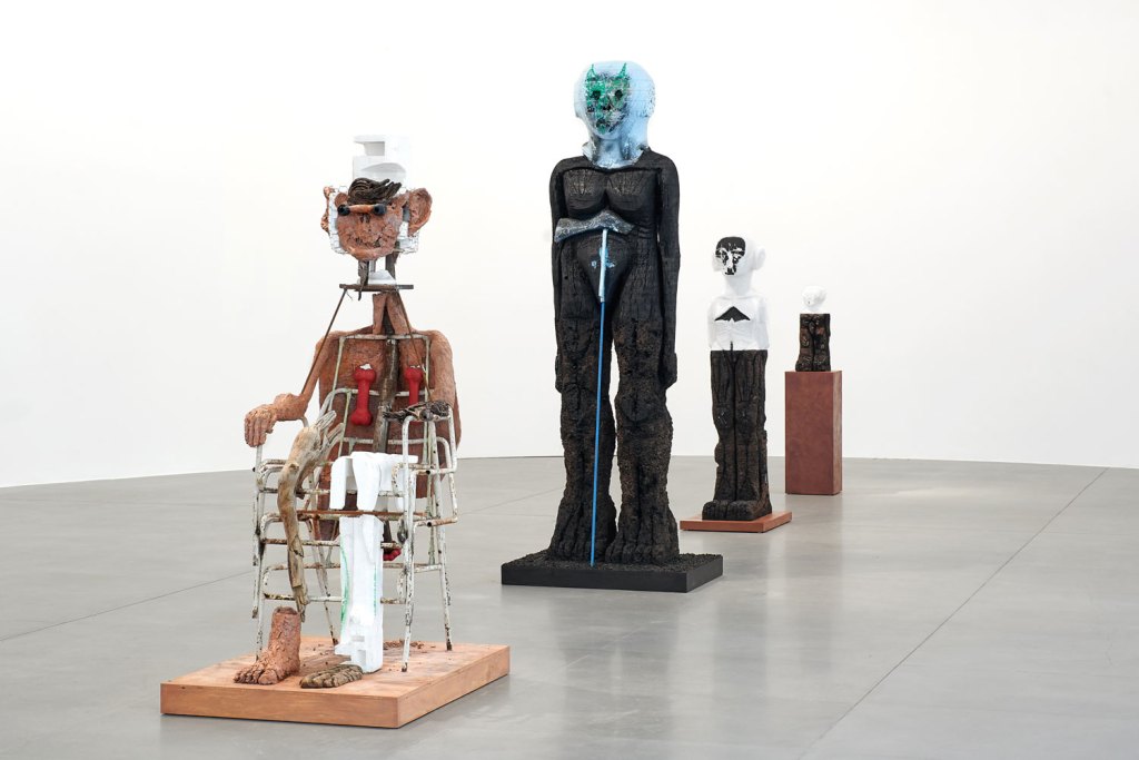“The Company” è la prima mostra a Roma di Huma Bhabha, e arriva dopo un percorso della notissima artista di origini pakistane già piuttosto lungo. Il suo linguaggio è andato formulandosi nel solco delle pratiche legate al Post-Human e all’anti-monumentalità – dunque due momenti nodali della storia dell’arte recente, a cavallo tra anni Novanta e Duemila, che possono offrire il fianco a rapide e approssimative definizioni – senza risultarne troppo invischiato. La mostra individua e sottolinea alcune specificità che da sempre appartengono alla sua poetica: un’idea di scultura veloce (uno dei suoi materiali d’elezione è da sempre il polistirolo, che permette una certa agilità compositiva), tendente alla performatività e a un flusso di coscienza che fa agglutinare attorno alle sue figure uno spettro di rimandi molto ampio – dall’arte primitiva e arcaica afferente a tradizioni diverse, fino al fumetto e al cinema horror”.