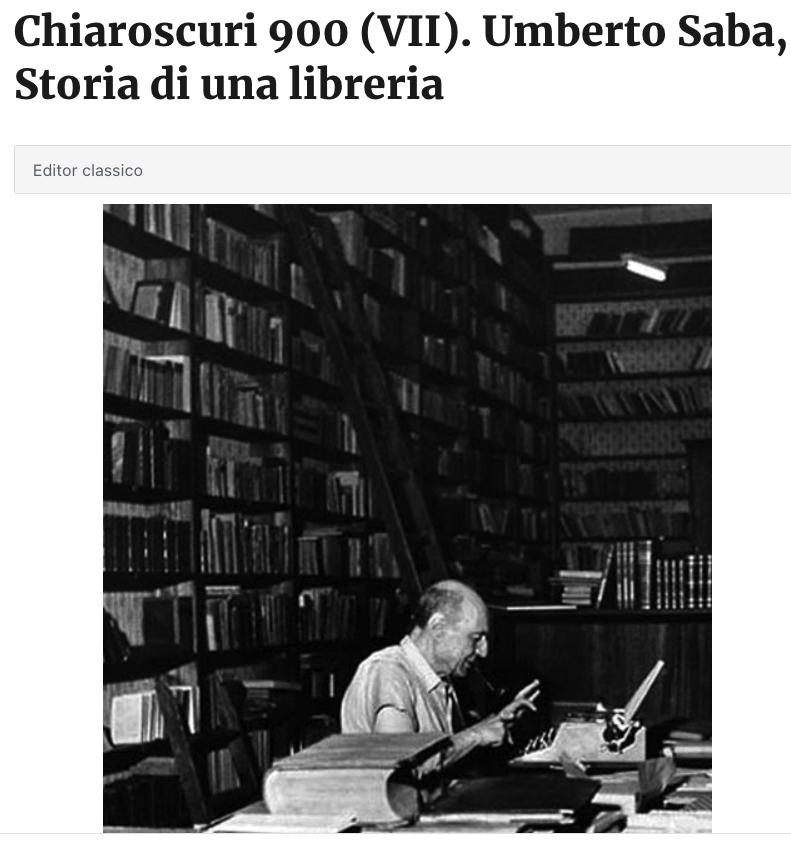 C’è un ordito in cui s’intrecciano svariati fili della matassa novecentesca in questa pagina che si presenta come una semplice e lineare autobiografia, ma che diventa un’abbastanza trasparente parabola: anzitutto, la componente psicoanalitica: il giovane Saba, ventiseienne, che rabbrividisce alla sola idea di passare la vita nell’antro polveroso di una libreria e che subito dopo la compra. Per non dire del rapporto coi vecchi libri, dei quali ha orrore, e che pensa di vendere per speculazione, ma dai quali finisce per essere catturato.