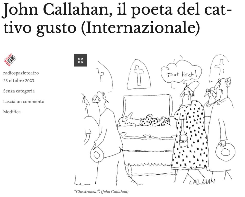 “Se qualcuno ride dicendo: ‘Non è divertente’, sai che sta leggendo John Callahan”, ha scritto P.J. O’Rourke. Nel 1992, quando ci siamo conosciuti, aveva appena rinunciato all’assistenza pubblica. Siamo rimasti in contatto per i successivi diciotto anni, durante i quali ha pubblicato le sue vignette in più di cinquanta giornali, tra cui il New Yorker e l’Independent (e in Italia Internazionale). Si è comprato una bella casa in una ricca zona della città e ha avuto un’assistente ventiquattr’ore su ventiquattro. Callahan teneva una bacheca in cucina, dove appendeva le lettere di protesta che riceveva dai lettori.