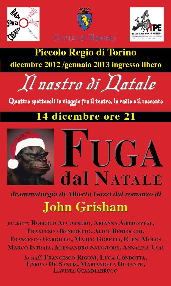 Con Fuga dal Natale John Grisham si è concesso un divertimento che lo porta lontano, per una volta, dal giallo giudiziario e dal monumentale impegno del best seller. A cercarlo bene, qualche elemento di suspense si ritrova anche nella storia di questa coppia di coniugi di mezza età che progettano di ribellarsi ai riti (e alle inutili spese) del Natale: riusciranno i nostri antieroi a resistere alle pressioni della loro piccola comunità alla quale appaiono improvvisamente come eversori delle tradizioni e dell’ordine costituito? Il plot è semplice, ma questo è il suo bello, perché l’autore gioca con la “variazione sul tema” come lo chef malizioso reinventa i piatti della tradizione aggiungendovi sapori inediti e imprevedibili. Nell’avventurarsi su un terreno così diverso da quello dei suoi più noti romanzi, Grisham procede con un passo abile e leggero che ricorda un genere ormai classico della cultura americana, la commedia alla Neil Simon; la riscrittura scenica, modellata sul radioteatro che stiamo sperimentando, ha assecondato la vocazione comica del testo originale, intervenendo, occorre dirlo, con una certa libertà. Confidiamo che l’autore, sicuramente un uomo di spirito, non se ne dispiacerebbe.